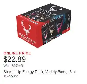 The price of Bucked Up Energy Drink, Variety Pack, 16 oz, 15-count can be found at the top of the page, together with the dates during which the offer is available. You can also check the price in the current Costco weekly ad or on the Costco website. Promotional offers assure you of buying Costco products at the lowest price.