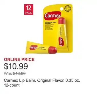 The price of Carmex Lip Balm, Original Flavor, 0.35 oz, 12-count can be found at the top of the page, together with the dates during which the offer is available. You can also check the price in the current Costco weekly ad or on the Costco website. Promotional offers assure you of buying Costco products at the lowest price.