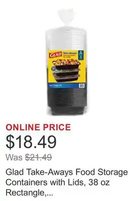 The price of Glad Take-Aways Food Storage Containers with Lids, 38 oz Rectangle, 35-sets can be found at the top of the page, together with the dates during which the offer is available. You can also check the price in the current Costco weekly ad or on the Costco website. Promotional offers assure you of buying Costco products at the lowest price.