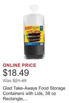 Costco offers a wide collection of products, besides the Glad Take-Aways Food Storage Containers with Lids, 38 oz Rectangle, 35-sets. Keep an eye on the weekly Costco weekly ad to find the best offers and promotions. Besides Glad Take-Aways Food Storage Containers with Lids, 38 oz Rectangle, 35-sets, you can also find the following offers: Food Containers, up & up 3-ct. 24-oz. snap & store food storage containers & McCormick Food Storage.