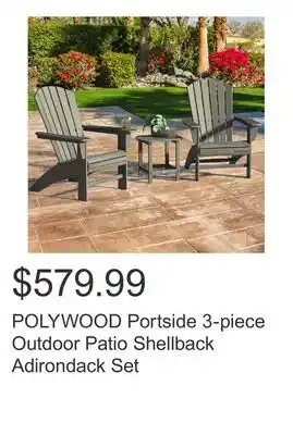 This POLYWOOD Portside 3-piece Outdoor Patio Shellback Adirondack Set is now on deal at Costco. All information about current prices, promotional conditions, and durations can be found on this page. Also check out other comparable deals and promotions related to POLYWOOD Portside 3-piece Outdoor Patio Shellback Adirondack Set, so you can always make the most cost-effective choice.The duration of the POLYWOOD Portside 3-piece Outdoor Patio Shellback Adirondack Set deal is from 30-12-2025 to 04-01-2026. If the deal is no longer valid, you can look at other comparable offers. You can also follow the product category to stay informed as soon as POLYWOOD Portside 3-piece Outdoor Patio Shellback Adirondack Set is on deal again at Costco. By comparing POLYWOOD Portside 3-piece Outdoor Patio Shellback Adirondack Set deals, you'll know whether it's wise to wait on a purchase because it might have been cheaper or might come up cheaper in a future deal. So keep an eye on our site to see if POLYWOOD Portside 3-piece Outdoor Patio Shellback Adirondack Set appears next week with a significant discount in the flyer.