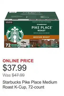 The price of Starbucks Pike Place Medium Roast K-Cup, 72-count can be found at the top of the page, together with the dates during which the offer is available. You can also check the price in the current Costco weekly ad or on the Costco website. Promotional offers assure you of buying Costco products at the lowest price.