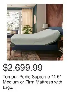 This offer is available in various stores, view all products to get the cheapest Tempur-Pedic Supreme 11.5 Medium or Firm Mattress with Ergo Adjustable Base. If you'd like to find out whether this product has a bigger discount in another store, check the category 'Wholesale'. You may also find these offers interesting: Tempur-Pedic Supreme 11.5 Medium Hybrid Mattress with Ergo Adjustable Base, Tempur-Pedic Supreme 11.5 Medium or Firm Mattress Only & Tempur-Pedic Supreme 11.5 Medium or Firm Mattress and Foundation.
