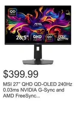 MSI 27 QHD QD-OLED 240Hz 0.03ms NVIDIA G-Sync and AMD FreeSync Gaming Monitor
