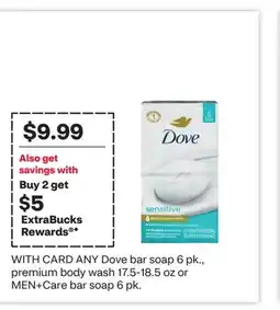 ANY Dove bar soap 6 pk., premium body wash 17.5-18.5 oz or MEN + Care bar soap 6 pk