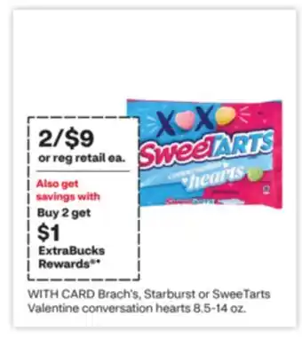 CVS offers a wide collection of products, besides the Brach's, Starburst or SweeTarts Valentine conversation hearts. Keep an eye on the weekly CVS weekly ad to find the best offers and promotions. Besides Brach's, Starburst or SweeTarts Valentine conversation hearts, you can also find the following offers: Brach's, Starburst, SweeTarts Valentine conversation hearts 8.5-14 oz or jelly hearts 12 oz, Brach's Conversation Hearts & Brach's Conversation Hearts.