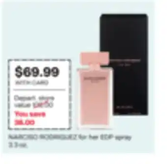 This offer is available in various stores, view all products to get the cheapest NARCISO RODRIGUEZ for her EDP spray. If you'd like to find out whether this product has a bigger discount in another store, check the category 'Drugstores'. You may also find these offers interesting: NARCISO RODRIGUEZ for her EDP spray 3.3 oz, BOUCHERON EDP spray & JIMMY CHOO EDP spray.