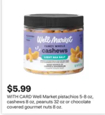Well Market pistachios 5-8 oz, cashews 8 oz, peanuts 32 oz or chocolate covered gourmet nuts 8 oz