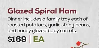 This offer is available in various stores, view all products to get the cheapest Glazed Spiral Ham Dinner. If you'd like to find out whether this product has a bigger discount in another store, check the category 'Grocery'. You may also find these offers interesting: Spiral-Sliced Ham Dinner, Honey glazed spiral sliced ham feast & Boneless Spiral Sliced Glazed.