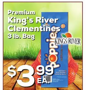 This offer is available in various stores, view all products to get the cheapest King's River Clementines. If you'd like to find out whether this product has a bigger discount in another store, check the category 'Grocery'. You may also find these offers interesting: CLEMENTINES, King's Hawaiian Dinner Rolls & Copper River Wild-Caught Sockeye Salmon.