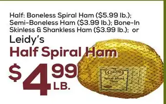 In which store will Leidy's Half Spiral Ham be on sale next week? These are some of the questions we get asked a lot. It’s only normal, nobody likes to pay too much! Our team keeps an eye on all deals and lists them online as soon as possible. So you can customize your (shopping) list with this week's offers and those of next week. Make sure to check next week’s DeCicco & Sons ad, some of the specials are only available next week or online.Frequently asked questions about Leidy's Half Spiral Ham