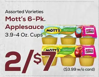 This offer is available in various stores, view all products to get the cheapest Mott's 6-Pk. Applesauce. If you'd like to find out whether this product has a bigger discount in another store, check the category 'Grocery'. You may also find these offers interesting: Mott's Applesauce 6 pk. or Pouches 4 pk. Assorted, Mott's Applesauce 6 pk. or Apple Juice 64 oz & Mott's Applesauce 6 pk. or Apple Juice 64 oz. or Capri Sun 10 pk., 6 oz.