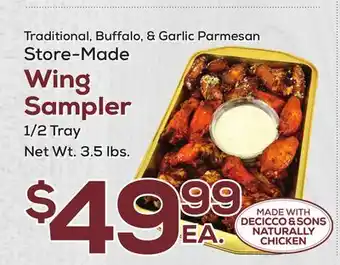 The price of Wing Sampler can be found at the top of the page, together with the dates during which the offer is available. You can also check the price in the current DeCicco & Sons weekly ad or on the DeCicco & Sons website. Promotional offers assure you of buying DeCicco & Sons products at the lowest price.