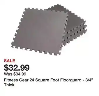 The price of Fitness Gear 24 Square Foot Floorguard - 3/4 Thick can be found at the top of the page, together with the dates during which the offer is available. You can also check the price in the current weekly ad or on the Dick's Sporting Goods website. Promotional offers assure you of buying Dick's Sporting Goods products at the lowest price.