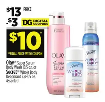 The Olay or Secret is available this week in the weekly ad of Dollar General, with an attractive discount. On this page, you’ll find all the information about current promotional prices, terms of the promotion, and special discounts. Browse through the weekly ad and check out other offers and promotions related to Olay or Secret to ensure you get the best deal.The deal for Olay or Secret is valid in week 52 and can be found in the current weekly ad. Has the deal expired? No worries, you can always check other interesting offers in the weekly ad. You can also follow the product category to be immediately informed when Olay or Secret is back in the weekly ad of Dollar General.
