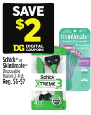 Dollar General offers a wide collection of products, besides the Schick or Skintimate Disposable Razors. Keep an eye on the weekly Dollar General weekly ad to find the best offers and promotions. Besides Schick or Skintimate Disposable Razors, you can also find the following offers: ALL Schick/Skintimate 4 ct., 12 ct. or Schick Xtreme 3 ct. disposable razors, ALL Schick/Skintimate 4 ct., 12 ct. or Schick Xtreme 3 ct. disposable razors & ALL Schick/Skintimate 4 ct., 12 ct. or Schick Xtreme 3 ct. disposable razors.