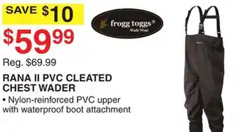 This offer is available in various stores, view all products to get the cheapest RANA II PVC CLEATED CHEST WADER. If you'd like to find out whether this product has a bigger discount in another store, check the category 'Sports'. You may also find these offers interesting: frogg toggs Cascades 2-Ply Cleated Bootfoot Chest Wader, Roof Panels PVC & PVC Flexible Board.