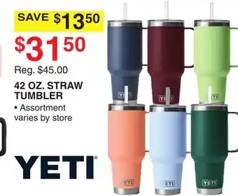 This offer is available in various stores, view all products to get the cheapest YETI 42 OZ. STRAW TUMBLER. If you'd like to find out whether this product has a bigger discount in another store, check the category 'Sports'. You may also find these offers interesting: YETI 42 OZ. STRAW TUMBLERS IN STOCK, 42 OZ. STRAW TUMBLER & YETI 35 OZ. AND 42 OZ. STRAW TUMBLERS IN STOCK.