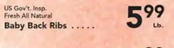 This offer is available in various stores, view all products to get the cheapest US Gov't. Insp. Fresh All Natural Baby Back Ribs. If you'd like to find out whether this product has a bigger discount in another store, check the category 'Grocery'. You may also find these offers interesting: US Gov't. Insp. Fresh All Natural Bone-In Country Ribs, US Gov't. Insp. Fresh All Natural Bone-In Country Ribs & US Gov't. Insp. Fresh All Natural Pork Hocks.