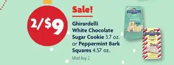 Ghirardelli White Chocolate Sugar Cookie 3.7 oz. or Peppermint Bark Squares 4.57 oz deals and online offers from the current Family Dollar weekly ad