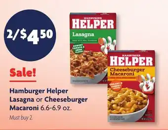 The price of Hamburger Helper Lasagna or Cheeseburger Macaroni can be found at the top of the page, together with the dates during which the offer is available. You can also check the price in the current Family Dollar weekly ad or on the Family Dollar website. Promotional offers assure you of buying Family Dollar products at the lowest price.