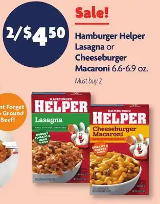The Hamburger Helper Lasagna or Cheeseburger Macaroni is available this week in the weekly ad of Family Dollar, with an attractive discount. On this page, you’ll find all the information about current promotional prices, terms of the promotion, and special discounts. Browse through the weekly ad and check out other offers and promotions related to Hamburger Helper Lasagna or Cheeseburger Macaroni to ensure you get the best deal.The deal for Hamburger Helper Lasagna or Cheeseburger Macaroni is valid in week 17 and can be found in the current weekly ad. Has the deal expired? No worries, you can always check other interesting offers in the weekly ad. You can also follow the product category to be immediately informed when Hamburger Helper Lasagna or Cheeseburger Macaroni is back in the weekly ad of Family Dollar.