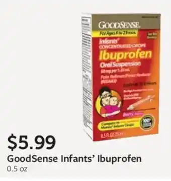 This offer is available in various stores, view all products to get the cheapest GoodSense Infants' Ibuprofen. If you'd like to find out whether this product has a bigger discount in another store, check the category 'Grocery'. You may also find these offers interesting: GoodSense Ibuprofen, Foster & Thrive IBUPROFEN & Meijer 200 mg Ibuprofen.