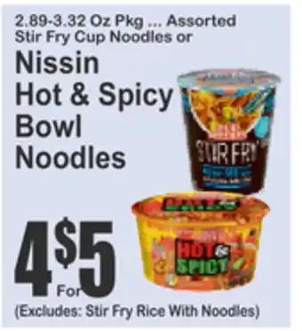 2.89-3.32 Oz Pkg ... Assorted Stir Fry Cup Noodles or Nissin Hot & Spicy Bowl Noodles deals and online offers from the current Almonte's Food Dynasty Marketplace weekly ad
