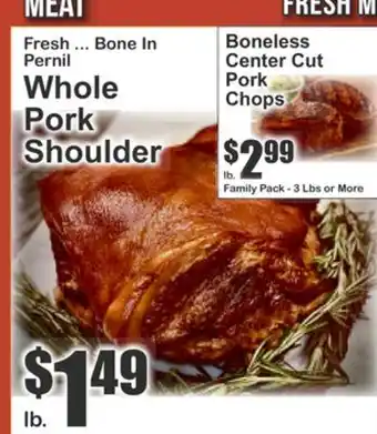 This offer is available in various stores, view all products to get the cheapest Fresh ... Bone In Pernil Whole Pork Shoulder. If you'd like to find out whether this product has a bigger discount in another store, check the category 'Grocery'. You may also find these offers interesting: Whole Pork Shoulder Roast, Pork Shoulder Bone-In Country Strips or Steaks & Bone-In Pork Shoulder Boston Butt Roast.
