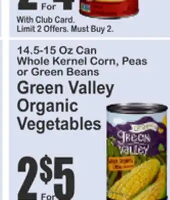 This offer is available in various stores, view all products to get the cheapest Green Valley Organic Corn, Peas or Green Beans. If you'd like to find out whether this product has a bigger discount in another store, check the category 'Grocery'. You may also find these offers interesting: Meijer Sweet Corn, Green Peas, Mixed Vegetables, Green Beans or Broccoli Cuts, Green Beans & Hy-Vee corn or green beans.