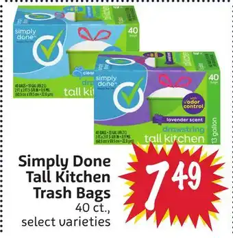 This offer is available in various stores, view all products to get the cheapest Simply Done Tall Kitchen Trash Bags. If you'd like to find out whether this product has a bigger discount in another store, check the category 'Grocery'. You may also find these offers interesting: up&up 100-ct. 13-gal. tall kitchen trash bags, GLAD FORCE FLEX TALL KITCHEN BAGS & GLAD FORCE FLEX TALL KITCHEN BAGS.