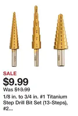 When is 1/8 in. to 3/4 in. #1 Titanium Step Drill Bit Set (13-Steps), #2 (6-Steps), and #3 (9-Steps) on sale? or "I want to know if 1/8 in. to 3/4 in. #1 Titanium Step Drill Bit Set (13-Steps), #2 (6-Steps), and #3 (9-Steps) will be discounted next week?" These are very common questions. Many people make a (shopping) list, with products that they are looking to buy next week. That’s why we always post next week’s flyers first. So you know exactly whether you need to wait a while before making a purchase or when to get it at the cheapest price. Keep an eye on our website to see if next week’s flyer has a deal on 1/8 in. to 3/4 in. #1 Titanium Step Drill Bit Set (13-Steps), #2 (6-Steps), and #3 (9-Steps).Will there be a promotion 1/8 in. to 3/4 in. #1 Titanium Step Drill Bit Set (13-Steps), #2 (6-Steps), and #3 (9-Steps) next week?