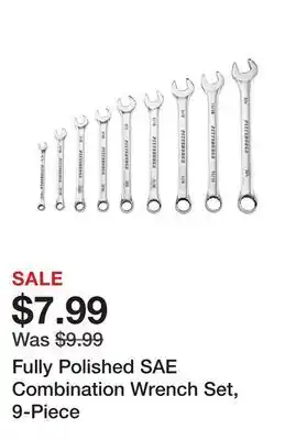 This offer is available in various stores, view all products to get the cheapest Fully Polished SAE Combination Wrench Set, 9-Piece. If you'd like to find out whether this product has a bigger discount in another store, check the category 'DIY'. You may also find these offers interesting: 20-Piece SAE & Metric Ratcheting Combination Wrench Set, Craftsman 7 Piece 12 Pt. Metric Combination Wrench Set & Adjustable Wrench Set, 3-Piece.