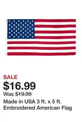 This offer is available in various stores, view all products to get the cheapest Made in USA 3 ft. x 5 ft. Embroidered American Flag. If you'd like to find out whether this product has a bigger discount in another store, check the category 'DIY'. You may also find these offers interesting: 3-ft x 50-ft Premium Landscape Fabric, 7-ft x 10.5-ft Navy Market Patio Umbrella & 5/8-in x 100-ft Heavy-Duty Hose.