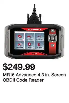 The price of MR16 Advanced 4.3 in. Screen OBDII Code Reader can be found at the top of the page, together with the dates during which the offer is available. You can also check the price in the current Harbor Freight Tools weekly ad or on the Harbor Freight Tools website. Promotional offers assure you of buying Harbor Freight Tools products at the lowest price.