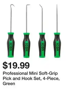 The price of Professional Mini Soft-Grip Pick and Hook Set, 4-Piece, Green can be found at the top of the page, together with the dates during which the offer is available. You can also check the price in the current Harbor Freight Tools weekly ad or on the Harbor Freight Tools website. Promotional offers assure you of buying Harbor Freight Tools products at the lowest price.