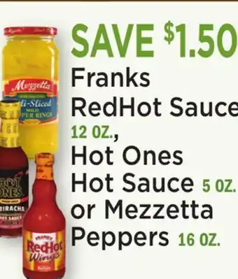 Franks RedHot Sauce 12 OZ., Hot Ones Hot Sauce 5 OZ. or Mezzetta Peppers 16 OZ