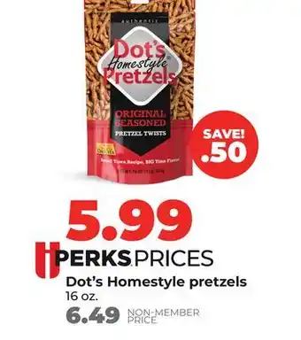 The price of Dot's Homestyle pretzels can be found at the top of the page, together with the dates during which the offer is available. You can also check the price in the current Hy-Vee weekly ad or on the Hy-Vee website. Promotional offers assure you of buying Hy-Vee products at the lowest price.