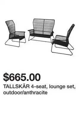 The price of TALLSKÄR 4-seat, lounge set, outdoor/anthracite can be found at the top of the page, together with the dates during which the offer is available. You can also check the price in the current Ikea weekly ad or on the Ikea website. Promotional offers assure you of buying Ikea products at the lowest price.