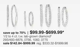 The price of 1/2 to 4 ct. t.w. lab-grown diamond§ can be found at the top of the page, together with the dates during which the offer is available. You can also check the price in the current JC Penney weekly ad or on the JC Penney website. Promotional offers assure you of buying JC Penney products at the lowest price.