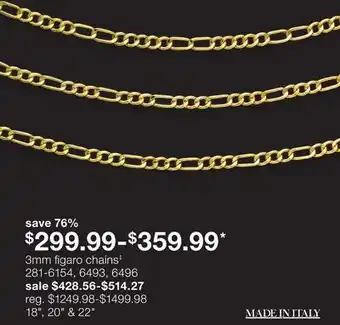 JC Penney offers a wide collection of products, besides the 3mm figaro chains. Keep an eye on the weekly JC Penney weekly ad to find the best offers and promotions. Besides 3mm figaro chains, you can also find the following offers: Figaro chains◊, 22 curb or figaro necklace & Rope chains‡.