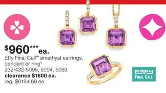 The price of Effy Final Call amethyst earrings, pendant or ring can be found at the top of the page, together with the dates during which the offer is available. You can also check the price in the current JC Penney weekly ad or on the JC Penney website. Promotional offers assure you of buying JC Penney products at the lowest price.