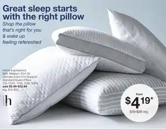 This offer is available in various stores, view all products to get the cheapest Home Expressions Soft, Medium, Firm Or Ultimate Extra Firm Support Standard/Queen Pillow. If you'd like to find out whether this product has a bigger discount in another store, check the category 'Department Stores'. You may also find these offers interesting: Sealy EternaLoft Soft/Medium Or Firm Standard/Queen Pillow, Fieldcrest Down- Alternative Medium Or Firm Standard/ Queen Pillow & Sealy Dream Touch Medium Or Firm Standard/Queen Pillows.