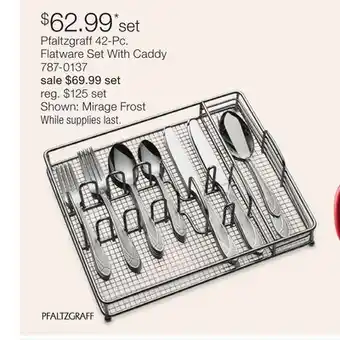 This offer is available in various stores, view all products to get the cheapest Pfaltzgraff 42-Pc. Flatware Set With Caddy. If you'd like to find out whether this product has a bigger discount in another store, check the category 'Department Stores'. You may also find these offers interesting: Mikasa Virtuoso 114-piece Flatware and Caddy Set, PFALTZGRAFF 53-PIECE FLATWARE SETS & 20-PIECE PFALTZGRAFF OR BOMBAY FLATWARE SETS.