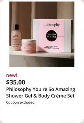 This Philosophy You're So Amazing Shower Gel & Body Crème Set is now on deal at JC Penney. All information about current prices, promotional conditions, and durations can be found on this page. Also check out other comparable deals and promotions related to Philosophy You're So Amazing Shower Gel & Body Crème Set, so you can always make the most cost-effective choice.The duration of the Philosophy You're So Amazing Shower Gel & Body Crème Set deal is from 02-03-2026 to 08-03-2026. If the deal is no longer valid, you can look at other comparable offers. You can also follow the product category to stay informed as soon as Philosophy You're So Amazing Shower Gel & Body Crème Set is on deal again at JC Penney. By comparing Philosophy You're So Amazing Shower Gel & Body Crème Set deals, you'll know whether it's wise to wait on a purchase because it might have been cheaper or might come up cheaper in a future deal. So keep an eye on our site to see if Philosophy You're So Amazing Shower Gel & Body Crème Set appears next week with a significant discount in the flyer.
