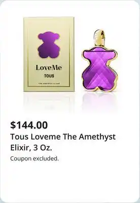This offer is available in various stores, view all products to get the cheapest Tous Loveme The Amethyst Elixir, 3 Oz. If you'd like to find out whether this product has a bigger discount in another store, check the category 'Department Stores'. You may also find these offers interesting: 5HR Energy Drinks 1.93 oz Odyssey Elixir 12 oz, Effy Final Call amethyst earrings, pendant or ring & Doritos 6-10.75 oz., Cheetos 6.5-8.5 oz., Fritos 9.25-10 oz. or Smartfood Popcorn* 5-7.75 oz.
