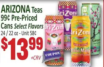 This offer is available in various stores, view all products to get the cheapest ARIZONA Teas 99¢ Pre-Priced Cans Select Flavors. If you'd like to find out whether this product has a bigger discount in another store, check the category 'Grocery'. You may also find these offers interesting: ARIZONA TEAS OR PUNCHES, Arizona Teas or Drinks & Crown Royal Whisky & Select Flavors 750 mL.