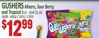 In which store will GUSHERS Mixers, Sour Berry, and Tropical be on sale next week? These are some of the questions we get asked a lot. It’s only normal, nobody likes to pay too much! Our team keeps an eye on all deals and lists them online as soon as possible. So you can customize your (shopping) list with this week's offers and those of next week. Make sure to check next week’s Jetro ad, some of the specials are only available next week or online.Frequently asked questions about GUSHERS Mixers, Sour Berry, and Tropical