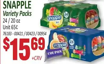This offer is available in various stores, view all products to get the cheapest SNAPPLE Variety Packs. If you'd like to find out whether this product has a bigger discount in another store, check the category 'Grocery'. You may also find these offers interesting: Snapple VARIETY PACKS, Snapple VARIETY PACK & Frito Lay Variety Packs.