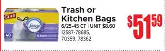 This offer is available in various stores, view all products to get the cheapest Trash or Kitchen Bags. If you'd like to find out whether this product has a bigger discount in another store, check the category 'Grocery'. You may also find these offers interesting: Tall Kitchen Trash Bags, Simply done kitchen or trash bags & Hefty Kitchen, Trash or Lawn & Leaf Bags.